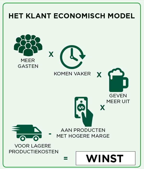 Deze stappen hebben wij op een logische wijze samen geclusterd in een klant economisch model. Hierbij kijken we naar activiteiten om meer bezoekers naar je zaak te trekken en deze bezoekers vaker te laten terugkeren. Daarnaast proberen we te helpen om het gemiddelde bestedingsbedrag te verhogen aan producten met een hogere marge. Als dit ook nog eens lukt tegen lagere kosten, dan heeft de ondernemer het model optimaal benut en creëren we samen duurzaam rendement.
