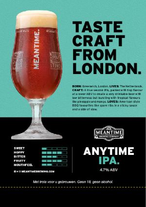 Anytime IPA is een authentieke Session IPA met een lager alcoholpercentage waardoor het een doordrinkbaar bier is. In elke fase van het brouwproces wordt hop toegevoegd om rijke aroma's te creëeren, zonder toevoeging van teveel bitterheid. Een verfrissend bier, boordevol tropische smaken als ananas en mango. Passend bij elke drinkgelegenheid gedurende het hele jaar!